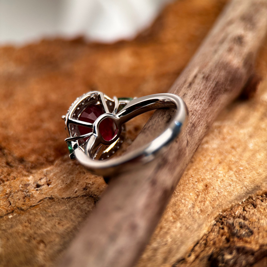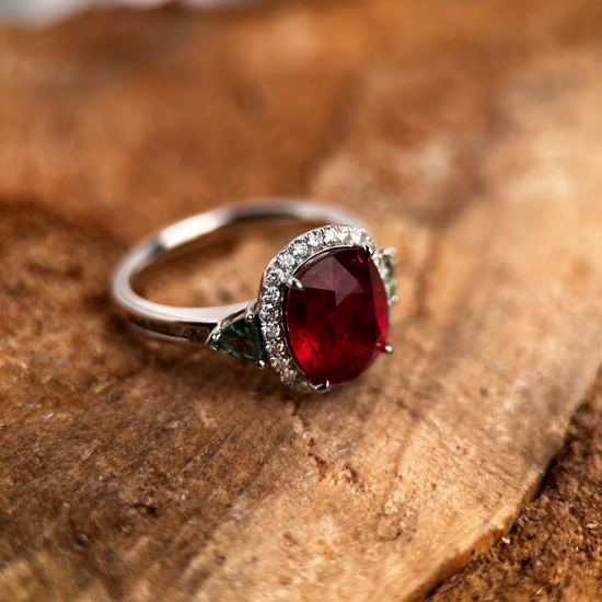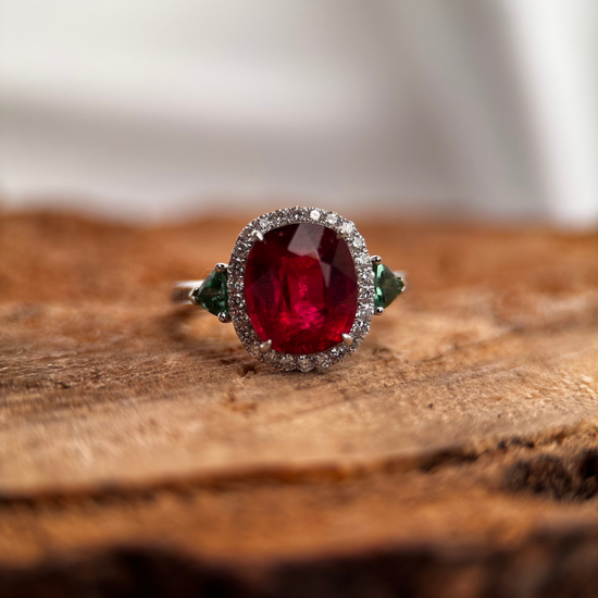 14K Kuddslipad Turmalin, Tsavorit & Diamanthalo-Ring