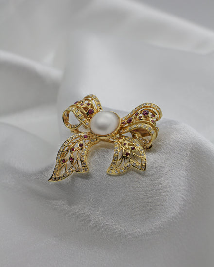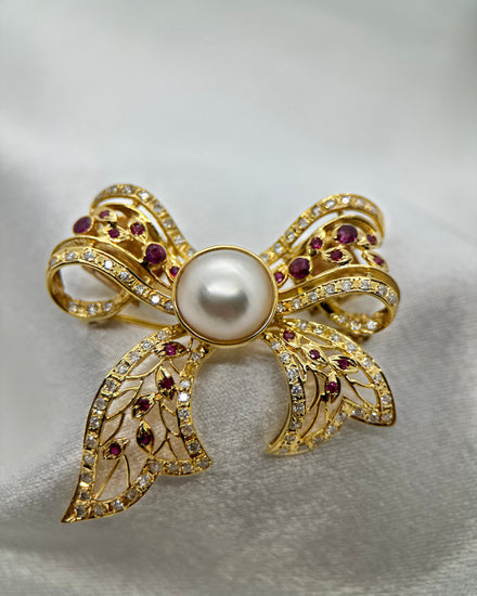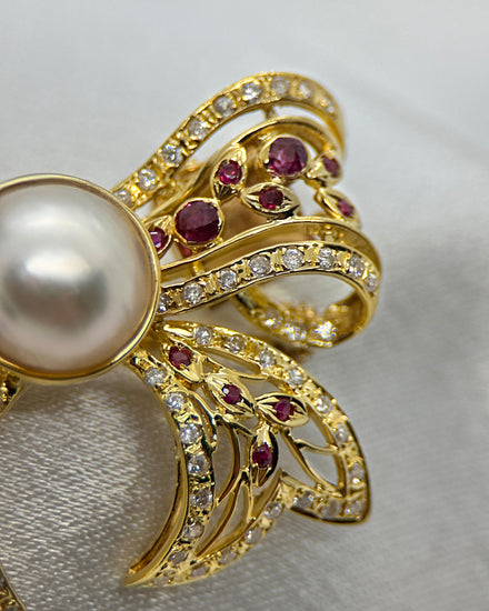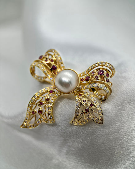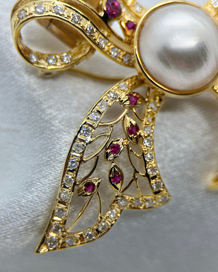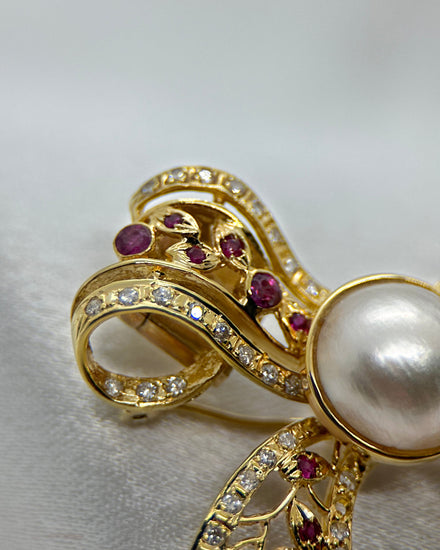 14K Guldhänge/Brosch med Mabépärla, Rubiner och Diamanter